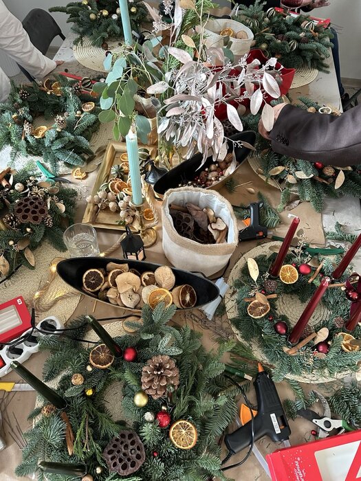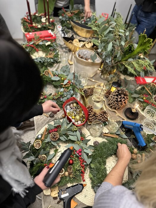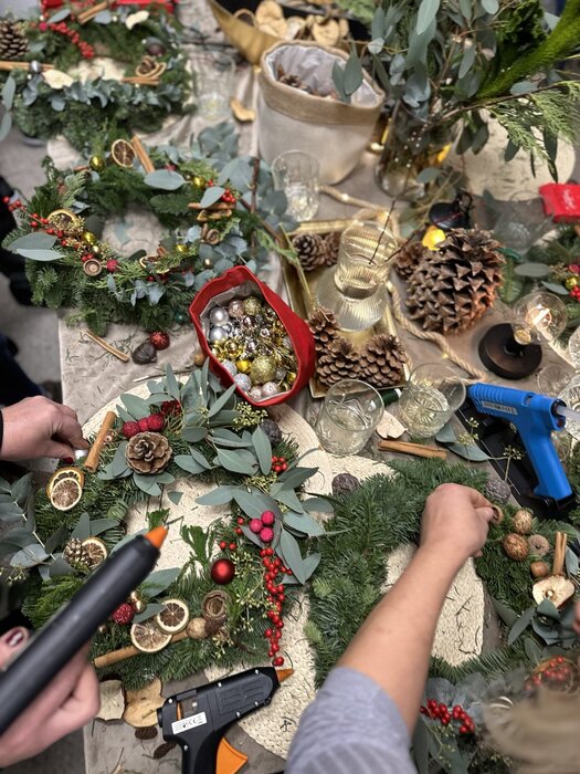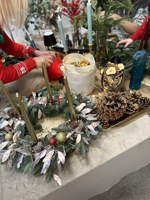 Jos vedamos kalėdinių vainikų dirbtuvės pasižymi jaukia atmosfera, individualiu dėmesiu ir subtiliu estetiniu požiūriu – kiekvienas dalyvis išsineša unikalų, profesionaliai atrodantį vainiką.
